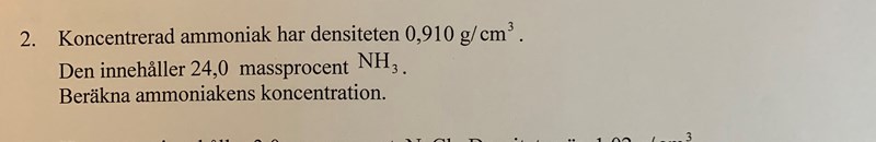 Du vet att 1 cm^3 konc ammoniak väger 0,910 g. 1 cm^3=1 ml. Hur många gram väger 1 liter konc ammoniak?