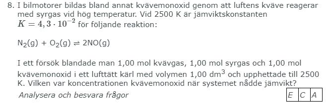 Jag försökte göra den här uppgiften och jag kom fram till att Q är större än K, dvs. reaktionen går åt vänster. Om den går åt vänster borde ju NO vara reaktant (hamnar i nämnaren) och O2 och N2 vara produkt (hamnar i täljaren), när man ska räka ut jämviktskonstanten. Men facit säger tvärtom och när jag räknar ut på mitt sätt så får jag att koncentrationen för NO blir högre, vilket inte är rimligt. Vad gör jag eller facit för fel?