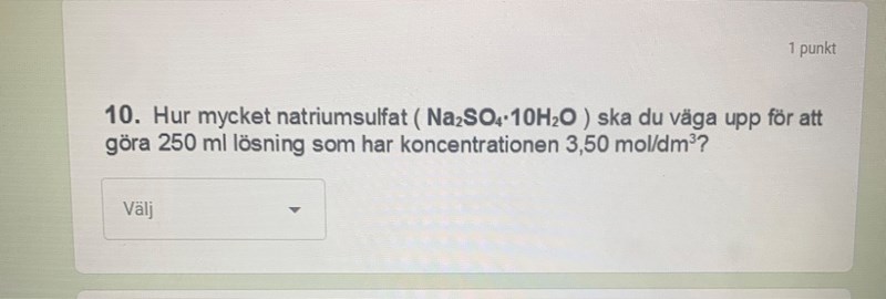 När du har tagit reda på molmassan, har du molmassan för Na2SO4 genom att addera allt det du fick från tabellen jag skrev innan. Sedan adderar du det men 10 gånger vattnens molmassa. Då får du den totala molmassan för molekylen i g/mol, men nu vill vi ha det i g/dm3. För att få ut hur många gram kan man försöka kolla på enheterna och ställa upp en ekvation. Vi kan börja med att få bort dm³, så dm³ är faktiskt samma liter. Så vi kan göra om 250 ml till dm³ genom att multiplicera 250 med 10⁻³, då får vi att 250ml = 0.25 liter.