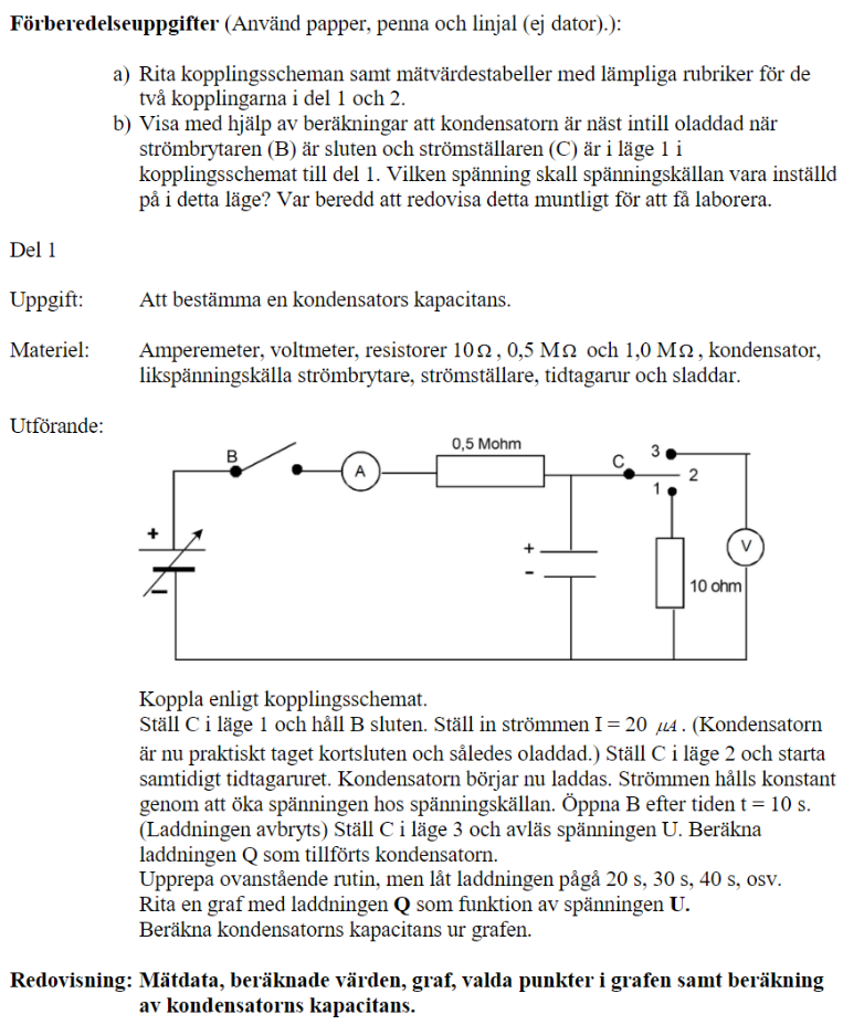 Eftersom B är sluten och C är i läge ett så kommer strömmen gå igenom 10ohms resistorn (om kondensatorn är laddad, vilket vi antar), vilket betyder att det går en spänning U2 över både resistorn och kondensatorn eftersom de är parallellkopplade: