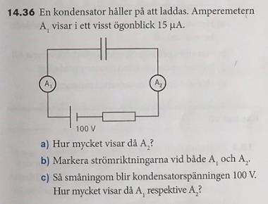 Är tillbaka på fråga a igen, borde inte strömmen i A2<A1 då kondensatorn laddas upp? Enligt grafen så minskar ju strömmen då spänningen över kondensatorn ökar?