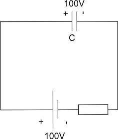 Hur mycket ström kommer att gå genom kretsen, när all spänning ligger över kondensatorn och spänningen över resistorn är 0?