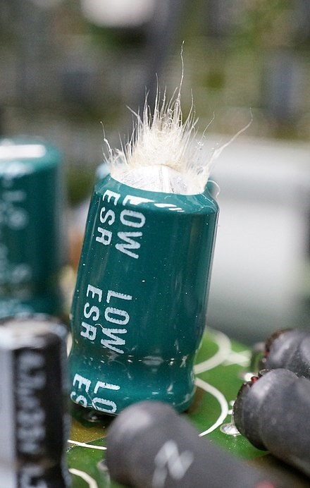 An electrolytic capacitor that has exploded via the vent port on the top, showing the internal dielectric material that was forced out.