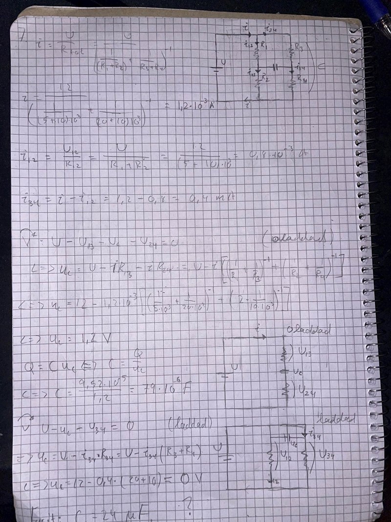 Jag har försökt lösa den men får fel svar. Det som jag inte förstår är om resistorena är parallellkopplade med kondensatorn eller i serie. Jag antog att när kondensatorn är fulladdad så går det ju ingen ström genom kondensatorn och då är de två andra grenarna parallellkopplade. Svaret ska vara C = 24 mikro Farad..jpg?width=800&upscale=false)
