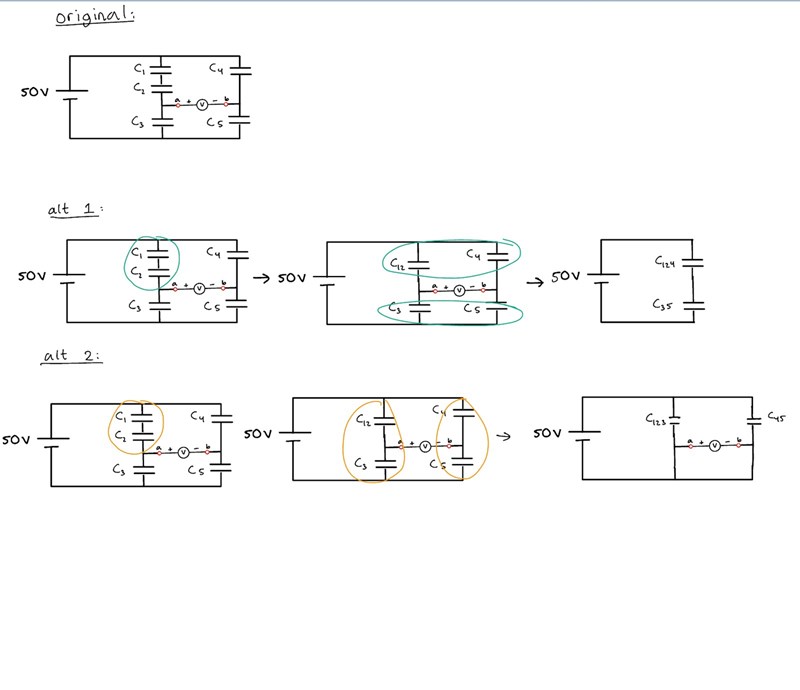 I kretsen nedan är alla kondensatorer fullt laddade. Sedan vid ett tillfälle kopplas en voltmeter mellan punkterna a och b i kretsen, frågan är vad för spänning som voltmetern ska visa vid detta ögonblick.
