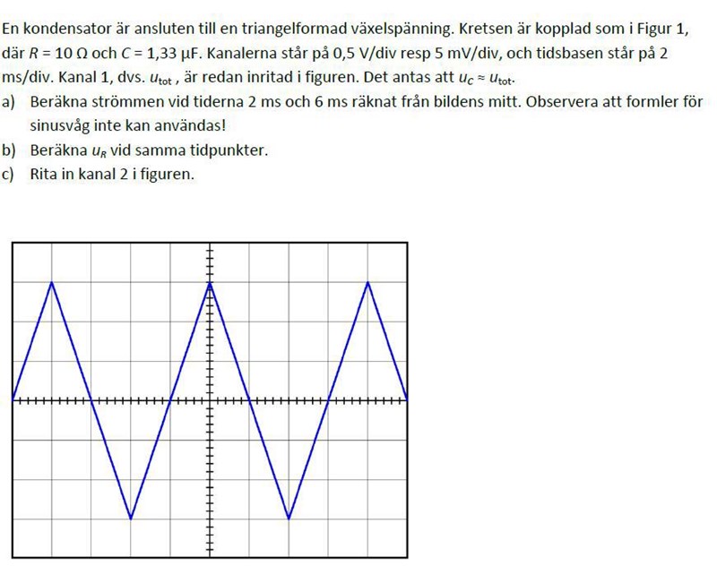 c) Det står faktiskt inte i uppgiften vad som kanal 2 ska vara men från sammanhanget vill jag tro att du förväntas rita grafen som beskriver spänningen över resistordelen som du får fram i b). Särskillt som skalan ska vara 5mV/div och spänningen över resistorn vid varje givet tillfälle är väldigt liten.