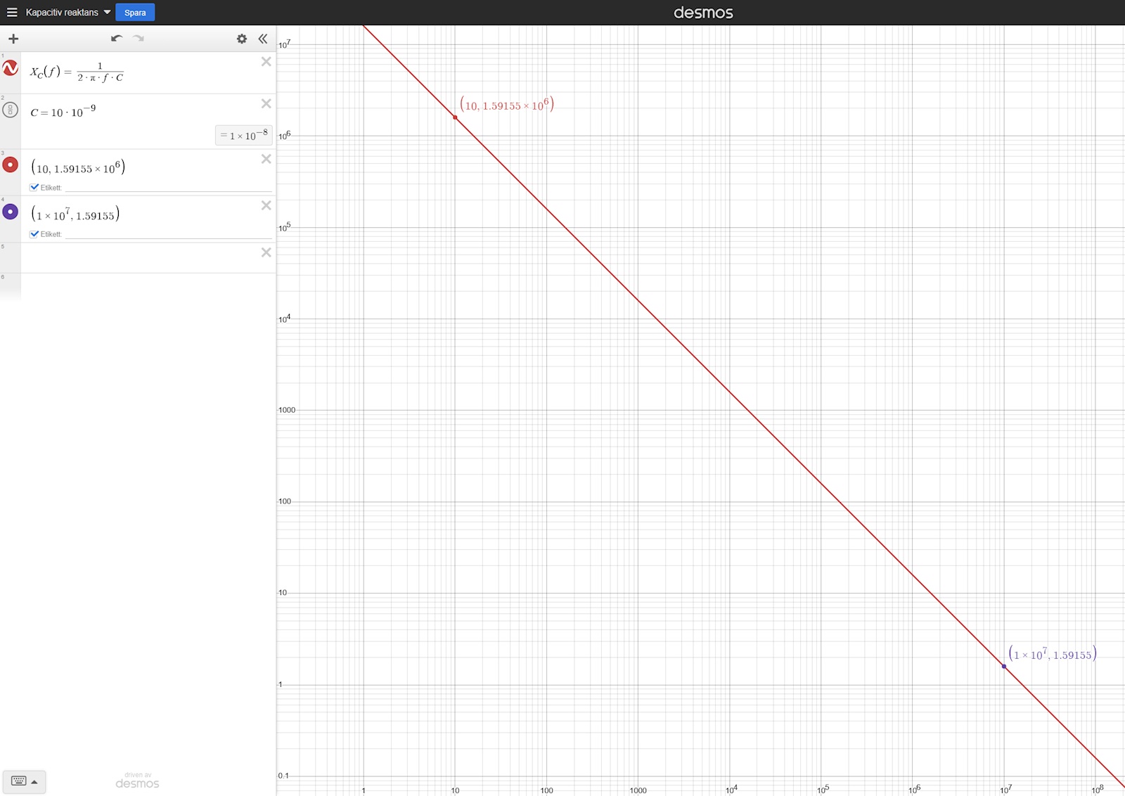 Om man tar en liten kondensator med C=10 nF (nanofarad, 10-8 F) och räknar på två olika frekvenser: