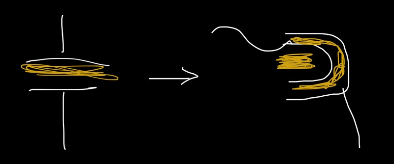 De påstår att det är två parallellkopplade kondensatorer, och vardera kondensator är arean av filmerna innan rullning med avstånd d lika med filmernas tjocklek. Är det då detta som händer?