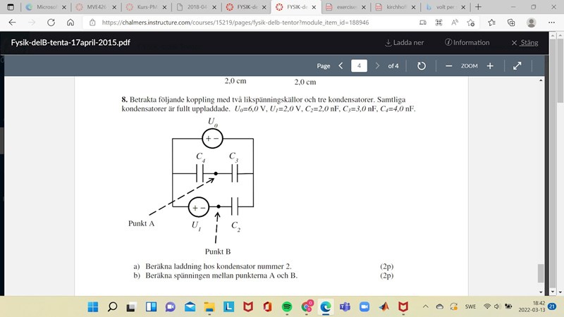 Någon som skulle kunna förklara hur jag ska gå tillväga med fråga b? Hur får jag fram spänningen som ligger över kondensator fyra?