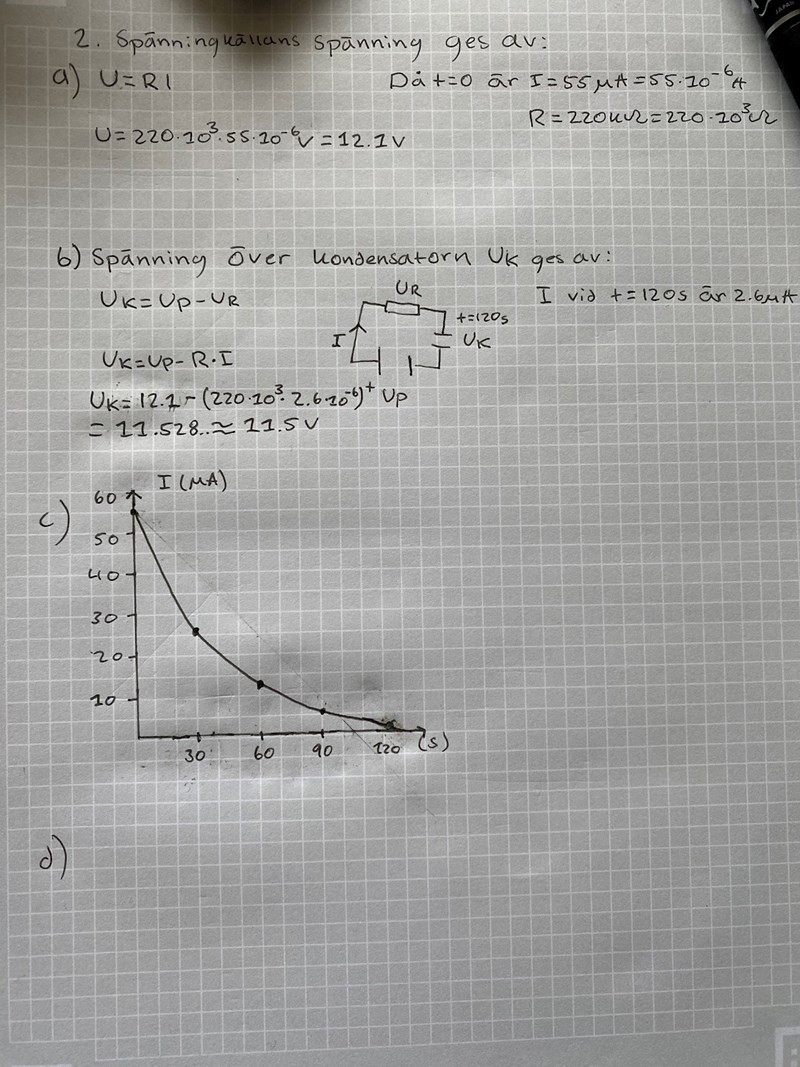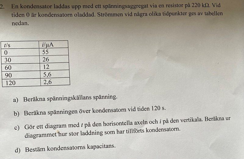 Hej, jag håller på med en uppgift som jag har kört fast lite vid. Jag har svarat på de tre deluppgifterna a), b), men kört fast vid d) c). Hur skall man beräkna laddningen som tillförts när man endast kan få fram delta Q i detta fall?