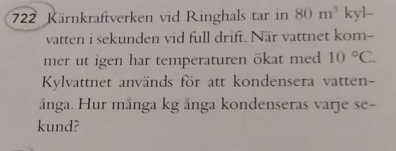 Du vet att man använder 80 m3 kylvatten varje sekund. Vilken massa har detta vatten? Det är m i din formel.