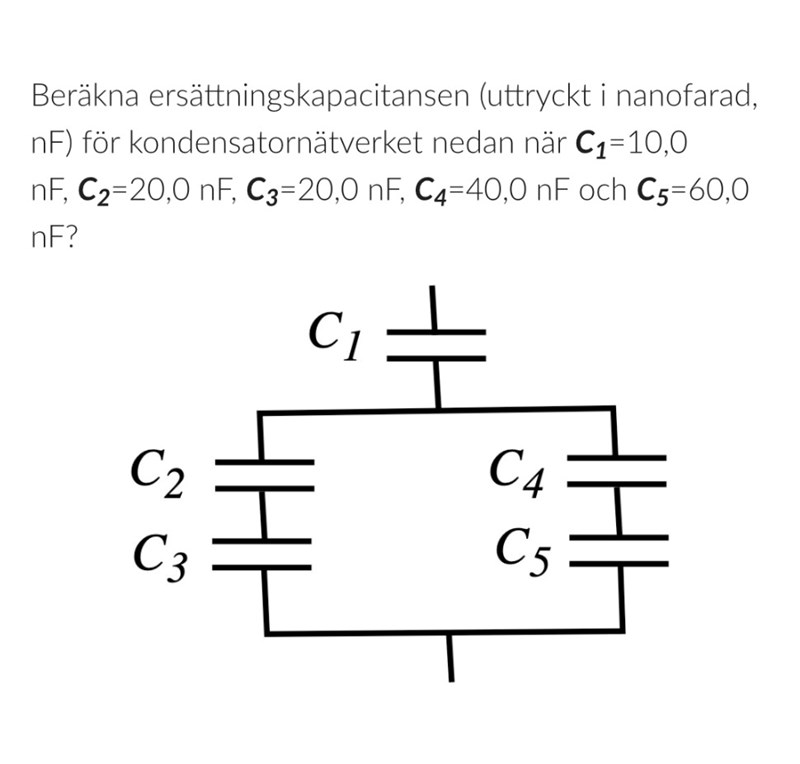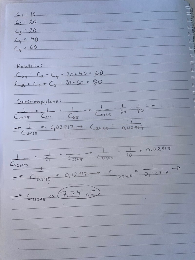 Hej, enligt min lösning blir svaret ca 7,74 nF, men det blir tydligen fel enligt facit. Jag förstår inte vart jag tänkt fel?