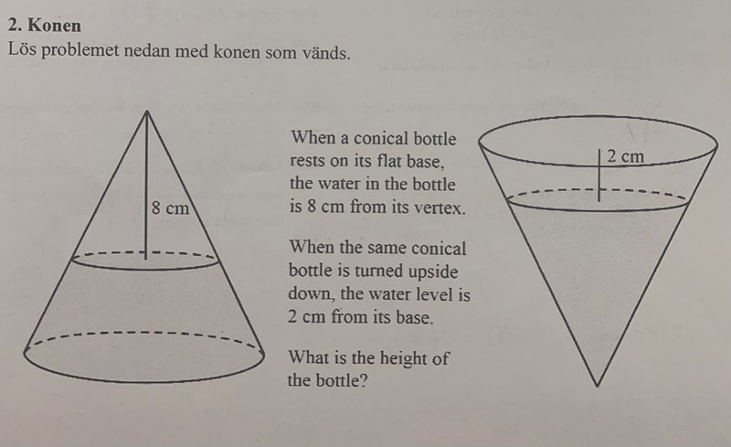 Jag vet att vattnets volym inte ändras utan är densamma i båda konerna. Förmodligen ska väl formeln för en kons volym användas men som sagt förstår jag inte hur.