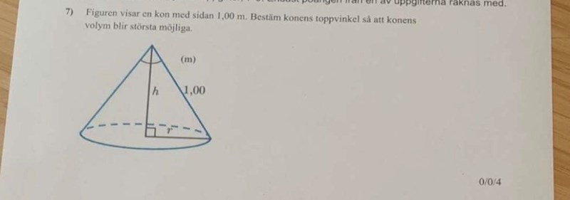 Eller ja, man skulle väl kunna räkna ut största möjliga volym först sedan ansätta höjd och radie för att få vinkeln efterhand såklart.