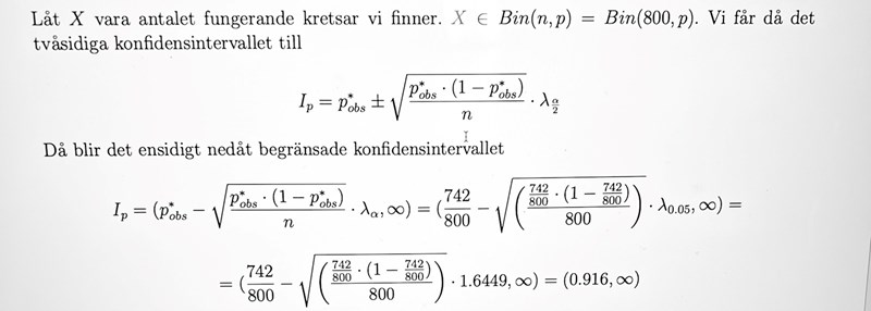 Detta är ett lösningsförslag på en uppgift att ange nedre gränsen på ett ensidigt begränsat konfidensintervall med graden 90%. Jag gjorde precis likadant hela vägen ända fram till att jag får att sista uträkningen blir 0,912 istället för 0,916. 0,912 är ett svarsalternativ (dock ett felaktigt) vilket får mig att tro att det är något jag missar och inte bara ett slarvfel men jag kan verkligen inte komma fram till hur det blir 0,916 när beräkningarna ger ett annat svar. Skulle verkligen uppskatta lite hjälp!