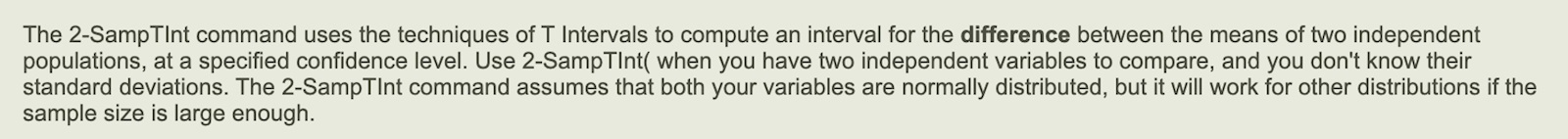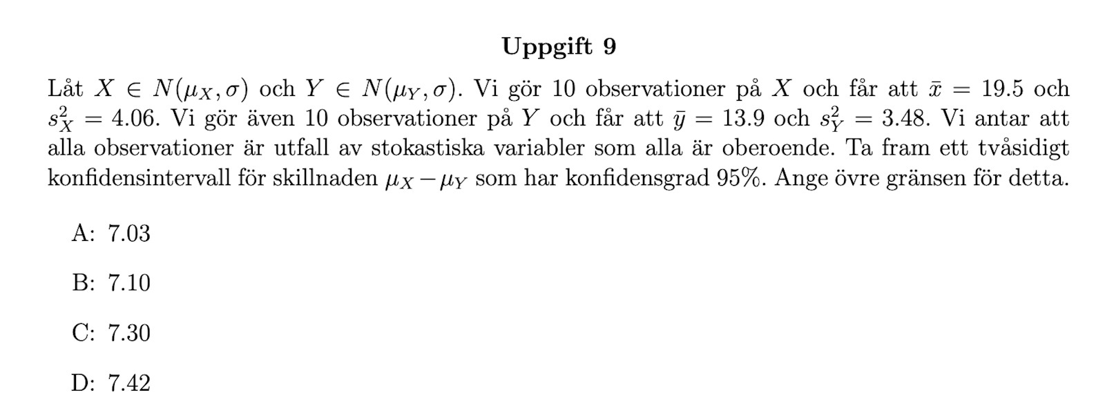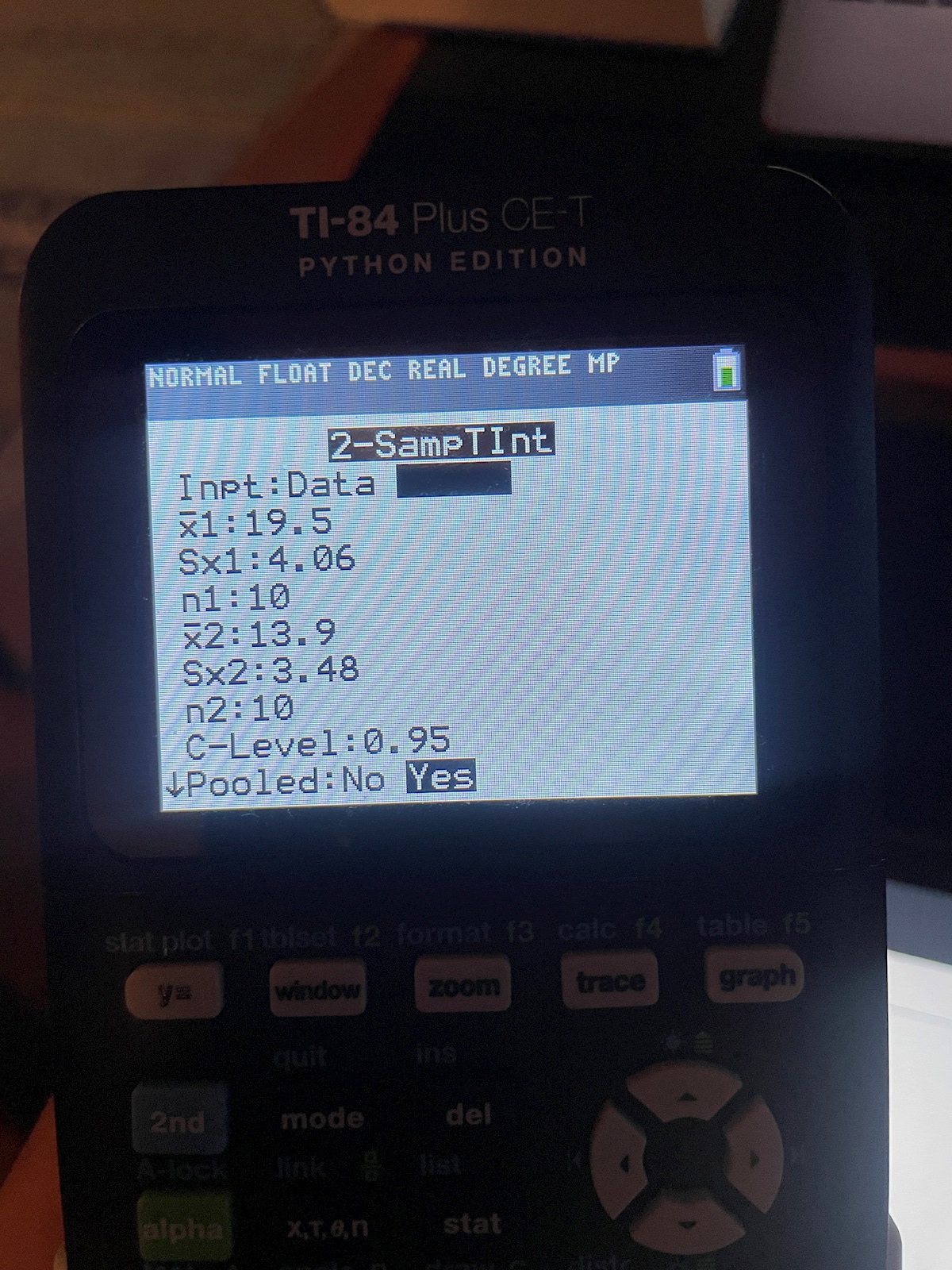 Hej! Fråga kring 2-SampTInterval på TI-84-miniräknaren. Borde jag inte kunna använda denna funktion för denna uppgift? Jag stoppar in alla värden men får fel intervall enligt facit. Erhållet intervall i räknaren blir (2.1474 ; 9.1526).