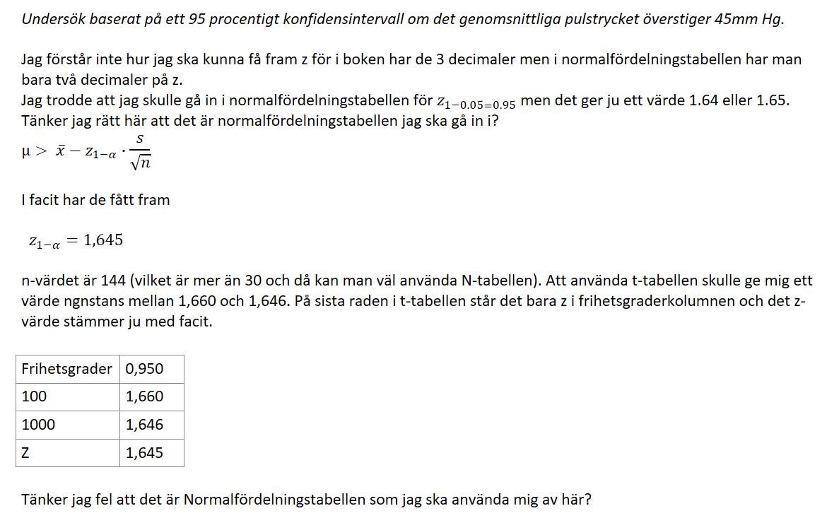 Konfidensintervall, n=144, ska man söka upp z i N-tabellen eller t-tabellen?