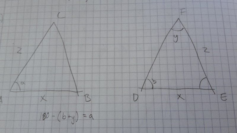 Tobias_S skrev :Ah ok, jo att SVS gör den kongruent tror jag att jag förstår jag. Men hur kommer man fram till att 180-(b+y) = a är E = a?