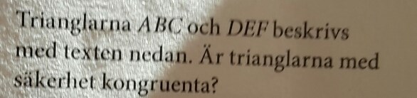 Den sista raden ger att vinkeln E = . Du vet alltså två sidor och mellanliggande vinkel. Räcker det för att du skall kunna avgöra om de båda trianglarna är kongruenta?