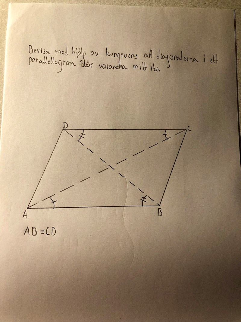 Bevisa med hjälp av kongruens att diagonalerna i ett parallellogram delar varandra mitt itu.