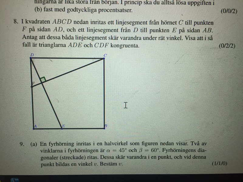 Behöver hjälp med uppgiften nedan. Det jag vet är att de båda har en rätvinkel och att sidan AD och DC är lika stora på grund av att de är en kvadrat. För att de ska vara kongruens måste vinkeln C och D vara lika stora vilket jag har svårt att bevisa. Jag tänkte att det kanske har något med att göra att de båda segmenten är vinkelräta vilket leder till att de skör den räta vinkeln lika mycket och där av bevisa att de är lika stora men är inte säker