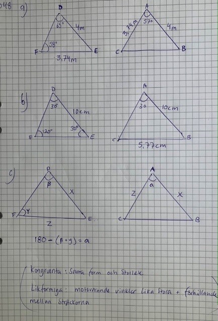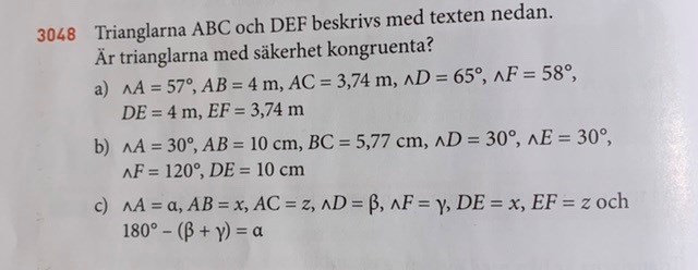 vet inte om jag är helt ute och cyklar då jag som hjälp till mig själv ritat upp trianglarna föra att se vart de befinner sig. Sedan vet jag inte helt hur jag skall tänka för att se om de är kongruenta.