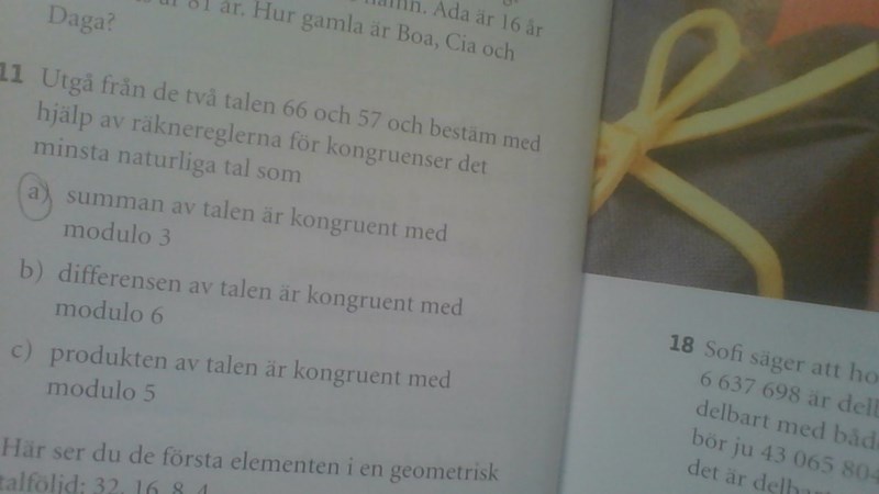 Utgå från de två talen 66 och 57 och bestäm med hjälp av räknereglerna för kongruenser det minsta naturliga tal som a) summan av talen är kongruent med modulo 3.