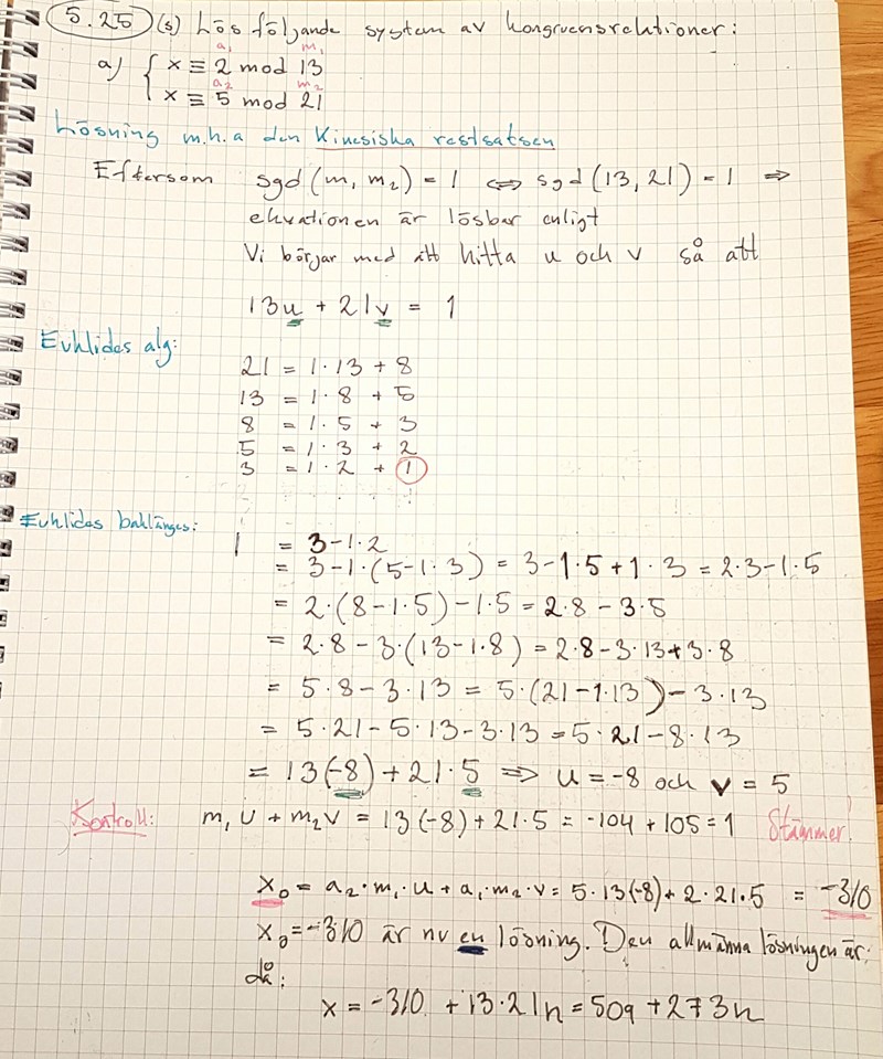 Jag har försökt lösa denna uppgift mha den kinesiska restsatsen och Euklides algoritm, och det har fungerat bra med en liknande uppgift. Dock får jag inte samma svar som facit där x0 = 236, och jag får -310. Har räknat om uppgiften 3 ggr, men kan inte se vad jag gör fel. Någon som ser vad jag gjort fel?