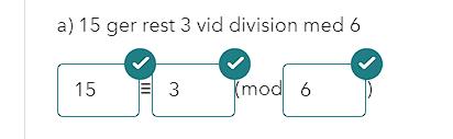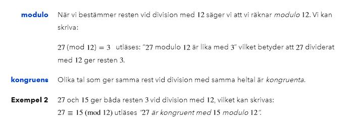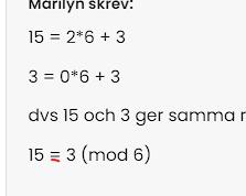 15 och 3 är lika om man räknar modulo 6. Men då har vi inga rester. Vi säger inte 15 mod 6 ger resten 3, utan 15 mod 6 = 3