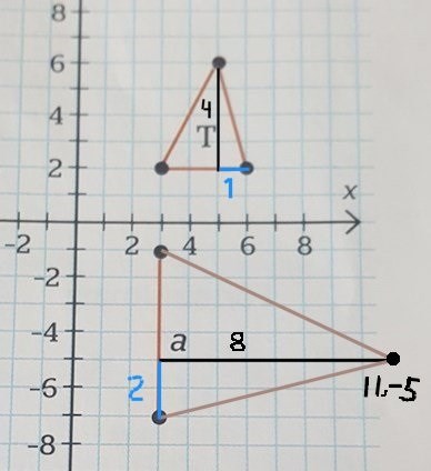 I den nya triangeln ska motsvarande höjd ha längden 8 le, med fotpunkt 2 le från ett hörn.