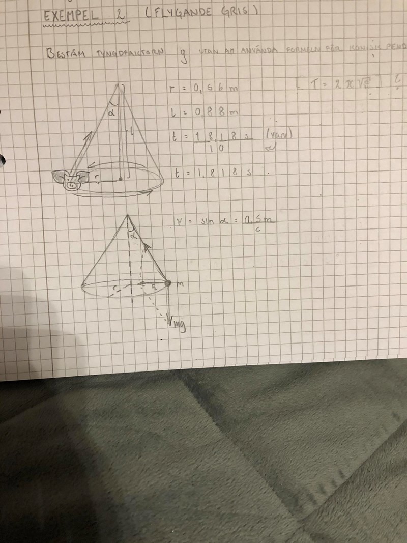 Bestäm tyngdfaktorn g utan att använda formeln för konisk pendel.