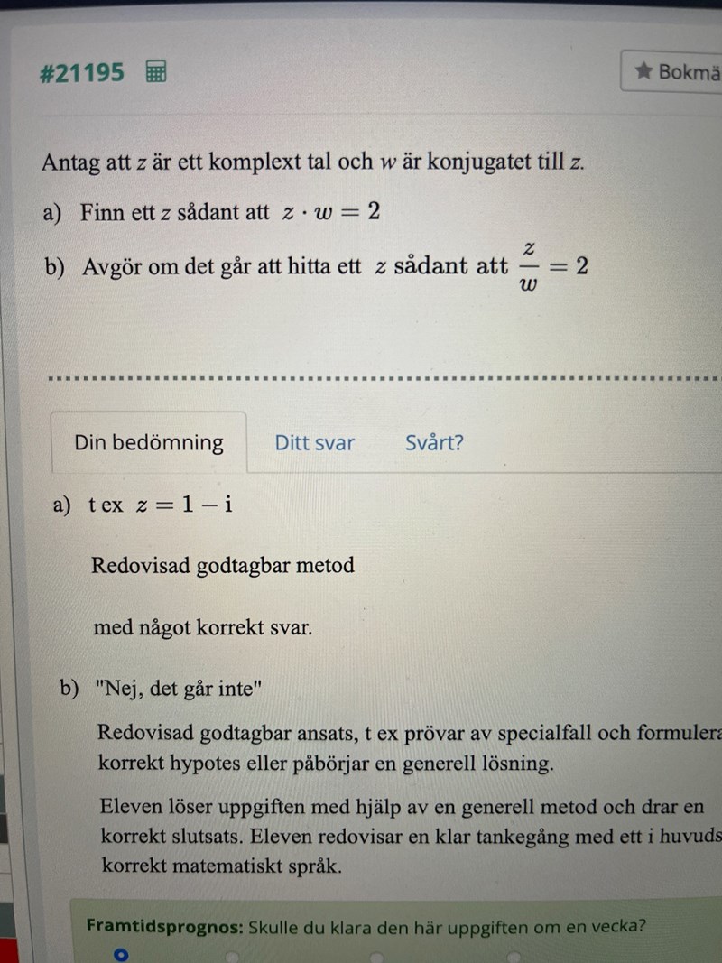 Hej! Jag behöver ha hjälp med b frågan. Jag vill lösa frågan med hjälp av en ”generell lösningsmetod” Jag har enbart lyckats lösa frågan genom att testa mig fram med olika värden Z och dess konjugat.