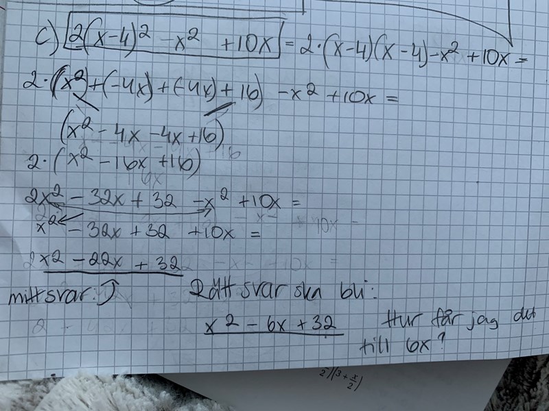 -4x-4x=-8x inte -16x så egentligen borde du få 2*(x^2-8x+16) -x^2 + 10x