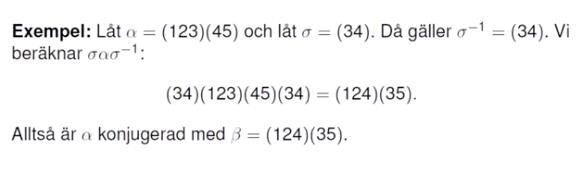 Att konjugera med en permutation innebär egentligen att man byter namn på sakerna enligt permutationen. Då (34) byter plats på 3 och 4 så måste (123)(45) konjugerat med (34) bli (124)(35). Hade vi tagit (12)(378)(456) konjugerat med (34)(16) så hade vi fått (62)(478)(351)=(135)(26)(478) då (34)(16) innebär att 3<->4 och 1<->6.