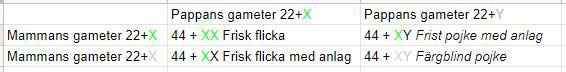 noranatur02 skrev:Könsbundet arv betyder att arvsanlaget sitter på könskromosomen. Som du säger är ärver inte enbart män färgblindhet till exempel.