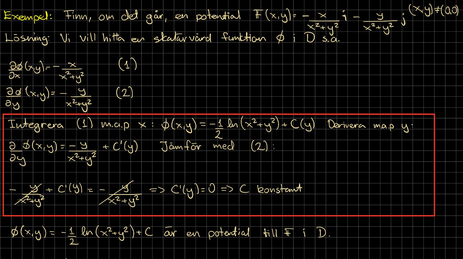 Jag gillar dina svar så jag ställer en till fråga, hoppas det går bra. Om så sägs vektorfältet vara konservativt. I bilden nere (specifikt röd ruta) så gör man just det, man sätter gradienten lika med vektorn F. Sedan börjar man integrera osv osv, men vad är det man egentligen vill åstadkomma med beräkningarna? I sista raden så har vi C’(y)=0 och här slutar beräkningarna, är det något specifikt med konstanten vi är ute efter? Eller är det helt enkelt så att vi vill kunna stryka båda termerna för annars får vi en extra term i som beror av (x,y) som vid derivering ger oss en konstant som inte kommer vara lika med F?
