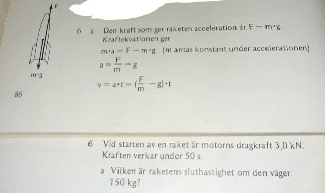 F är kraften som verkar uppåt, -mg verkar nedåt. När dessa slås ihop fås en "summakraft", den resulterande kraften som accelererar raketen. Och eftersom det är en kraft kan den skrivas som ma, enligt Newtonlagen.