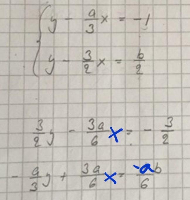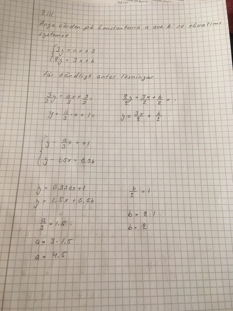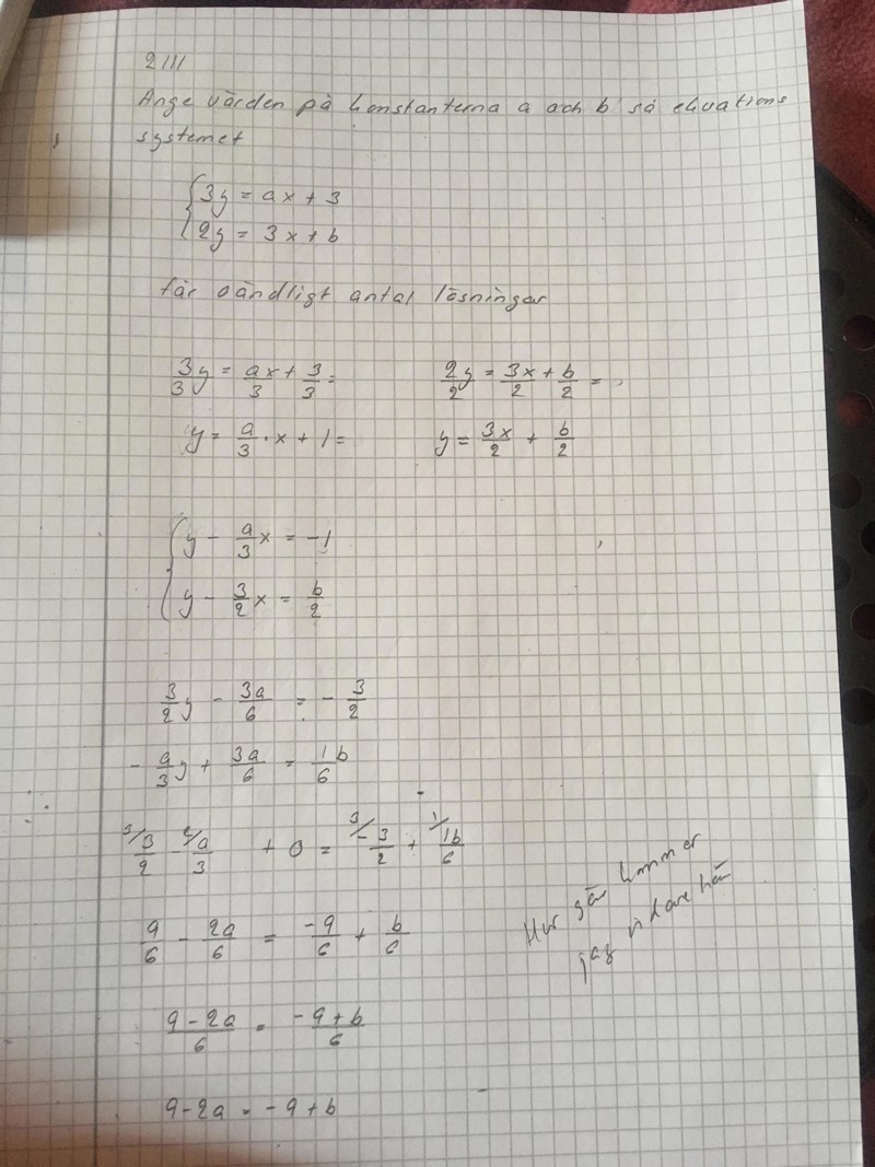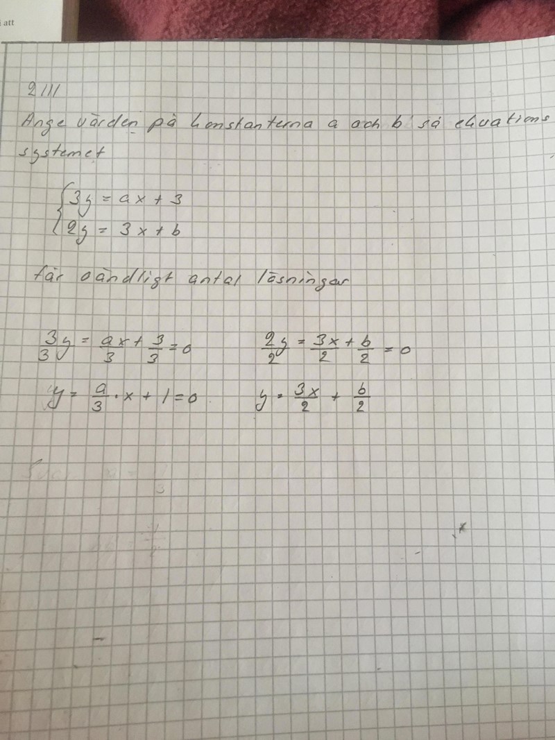 Om det ska finnas oändligt många lösningar så betyder det att båda ekvationerna beskriver samma linje (annars finns det ju bara en skärningspunkt, eller möjligen 0 om de är parallella). Att det är samma linje betyder att de ska ha samma k-värde och samma m-värde. Vilka värden på a respektive b ger identiska k- och m-värden för de båda linjerna?