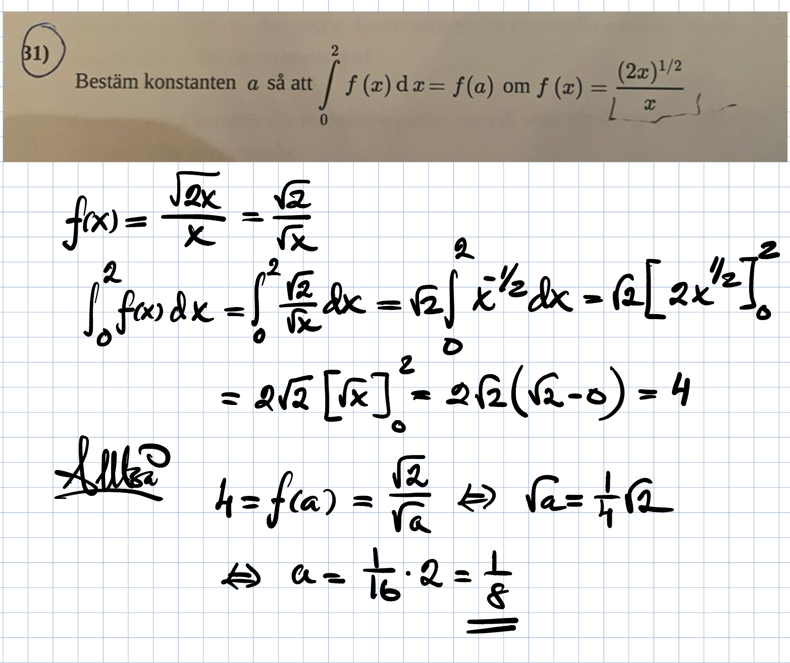 Jag räknade ut det till 4 men förstår inte om det är rätt eftersom det i facit står att konstanten a=1/8. Förstår inte vad det innebär att funktionen är lika med f(a). Jag tänkte att det betydde att integralen av f(x)=a men då är det fel svar, hittar inte heller några fel i integralens uträkning. Om jag gjort rätt innebär det att f(1/8)=4 men då fattar jag inte hur jag kommer till det. Någon som kan förklara???