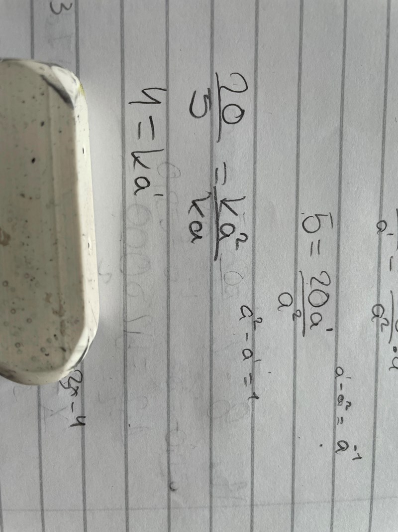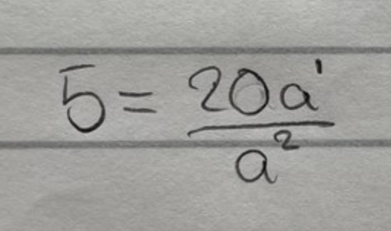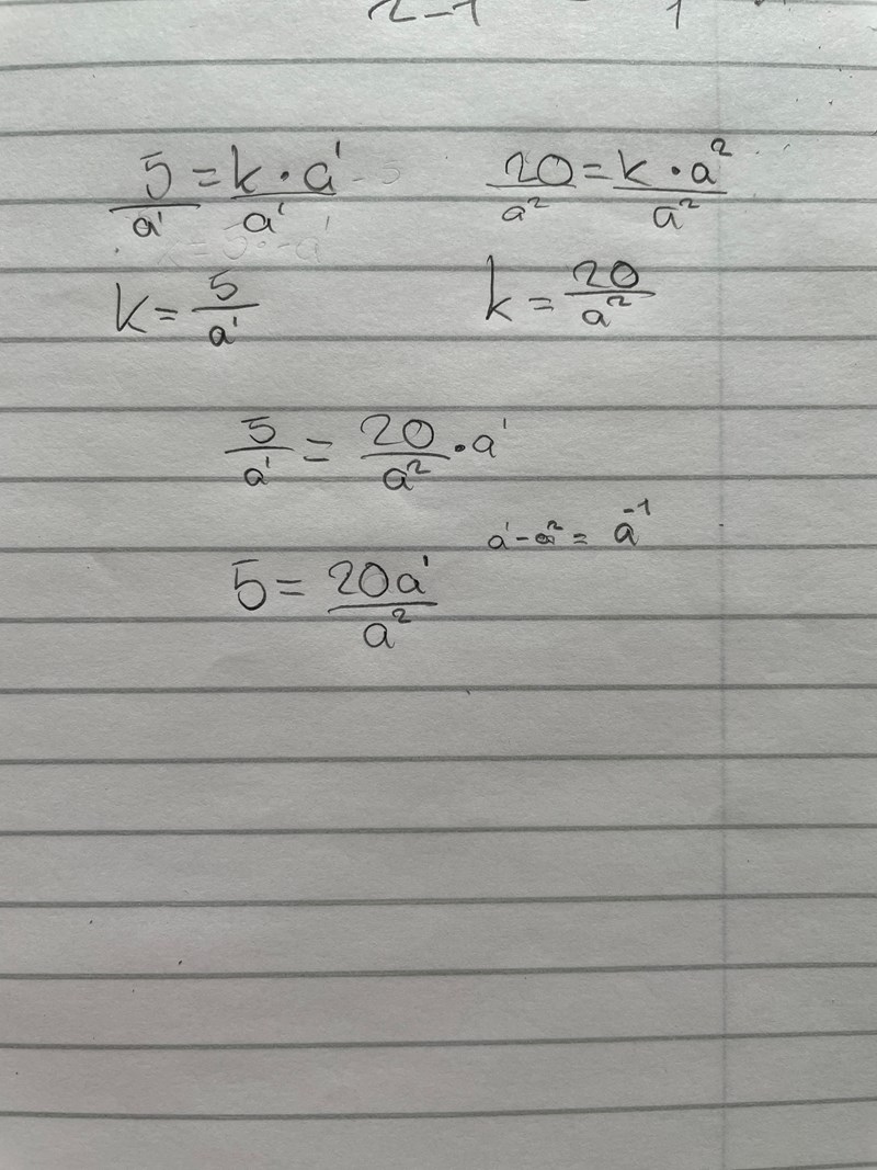 Nästa steg är att dela 20 = ka2 med 5 = ka. Vad blir när du förenklar båda led? Eller är det bättre att skriva ?