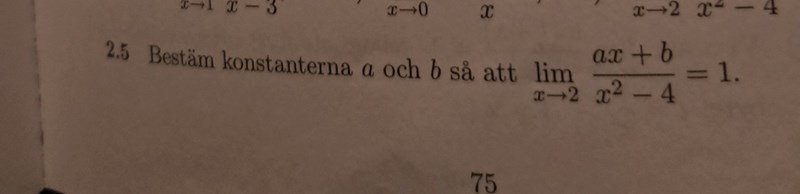 Uppgiften är ju att bestämma a och b så att gränsvärdet verkligen blir 1.Hur ser kvoten ut innan dess?