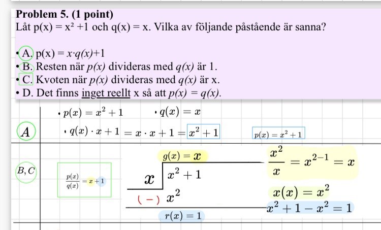 Låt p(x) = x² +1 och q(x) = x. Vilka av följande påstående är sanna?