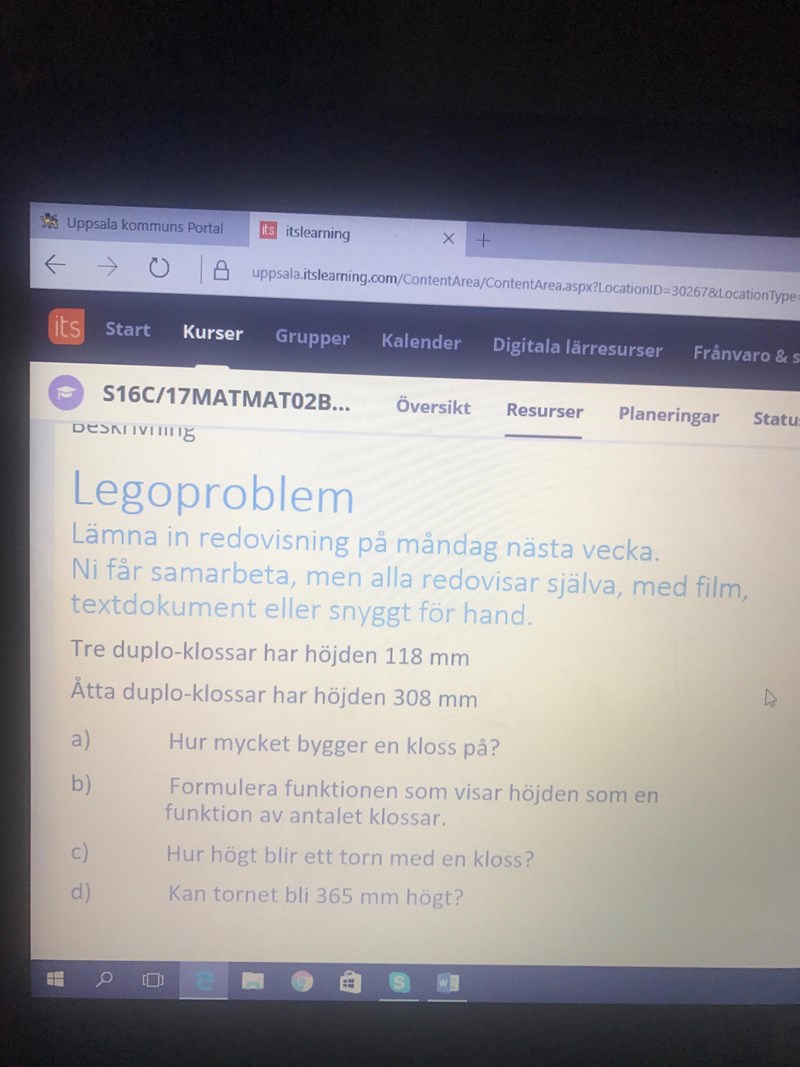 Börja med att göra a-uppgiften. Vet du hur en Duplo-kloss ser ut? Två duploklossar på varandra är mindre än dubbelt så höga som en duplo-kloss, eftersom knopparna på ovansiddan passar in i hålen på undersidan av nästa kloss. Med de siffror du ha ri uppgiften kan du räkna ut hur mycket 5 klossar bygger på, och delar du det med 5 får du hur mycket en kloss bygger på. Det är alltså hela höjden minus knopparnas höjd.