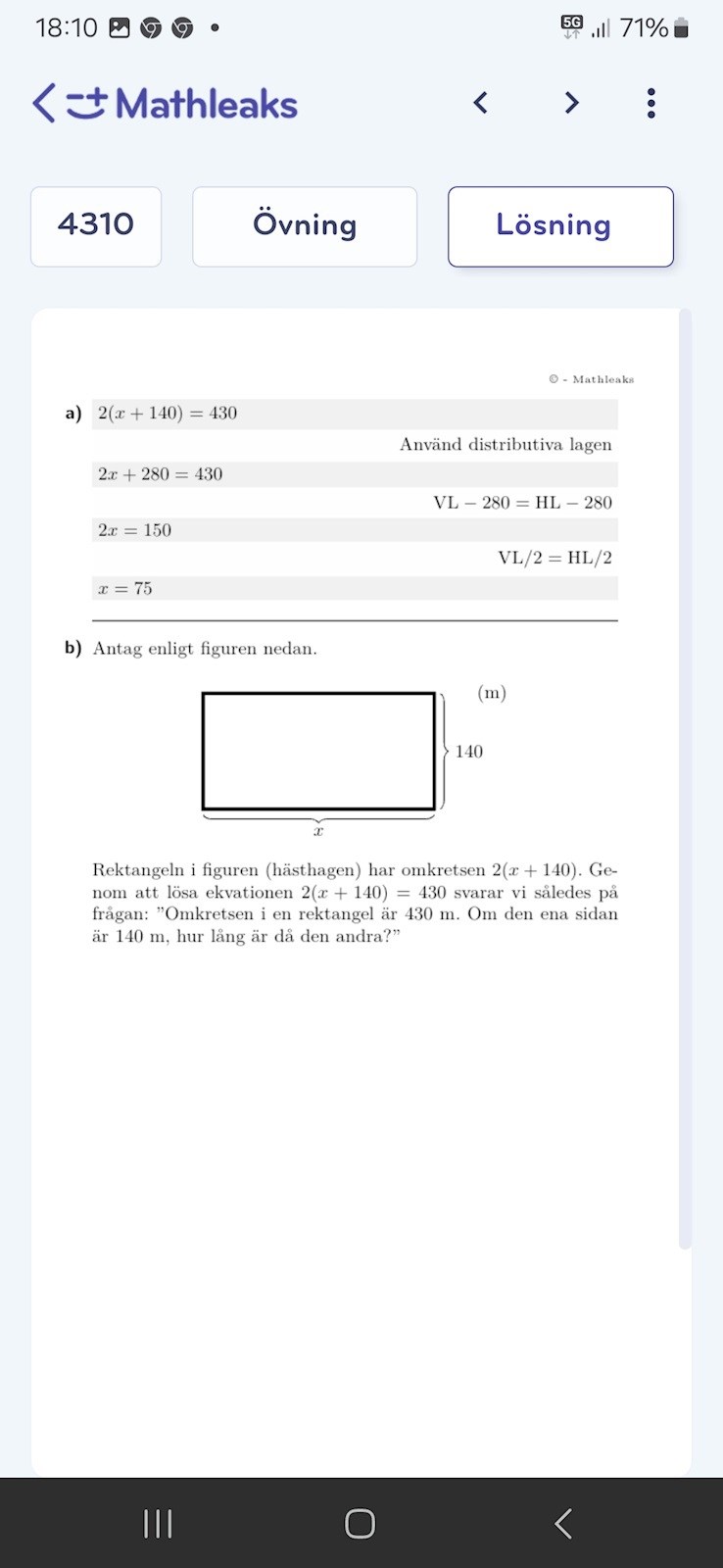Lösningen på ekvationen är x= 75 m. Bifogar skärmdump på förklaring från mathleaks där x motvarar den långa sidan som endå enligt uträkningen är kortare än kortsidan (140 m)