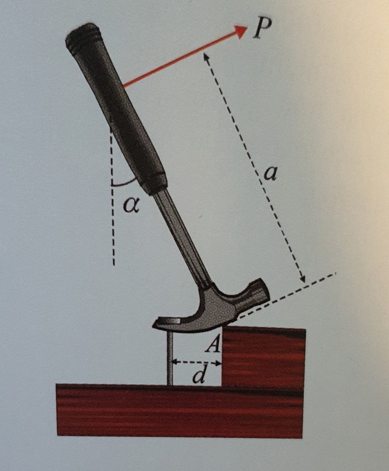 Linjen P är en normal till hammarskaftet, d v s det är en rät vinkel mellan P och hammarskaftet.
