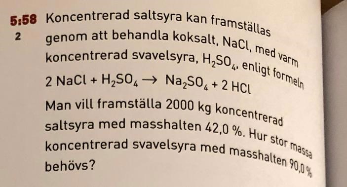 Jag trodde inte att detta skedde i vatten, det kanske annars skulle stått (aq). Jag trodde att det var 58% orenhet i form av natriumsulfat, de kan hellre berätta hur mycket ren HCl de vill ha. Beräkningen 0,45*2000 är inte så jobbig men det är knappast något man lär sig mer av heller av att de lägger till.