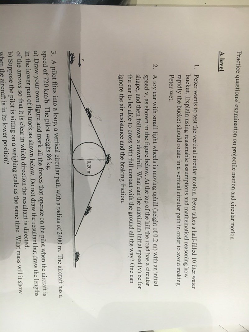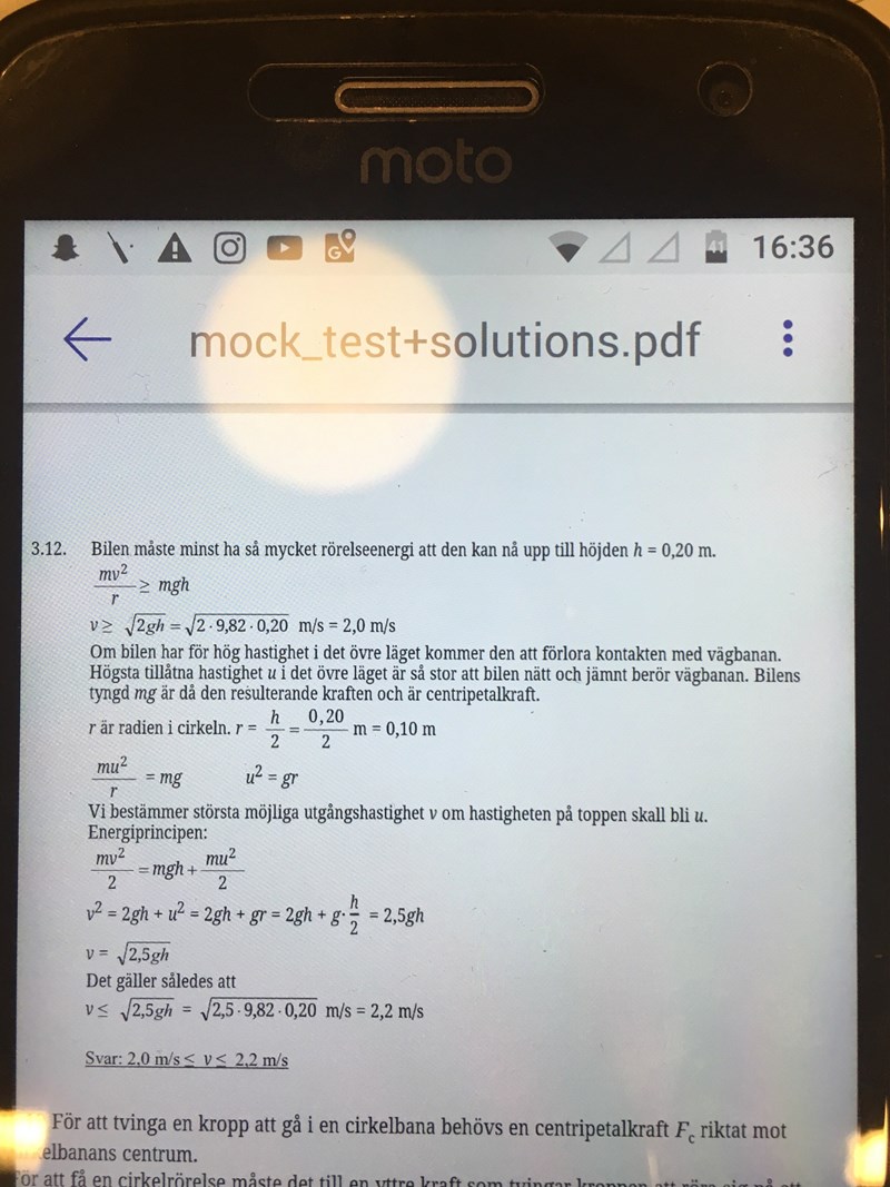 Hej här har jag en mycket förvirrande fråga. Vi har räknat ut att med den höjdskillnaden som angavs i frågan så ska hastighetsförlusten mellan botten och toppen vara 2m/s eftersom . Uppenbarligen kan man inte anta att hastighetsförusten alltid är 2m/s. Facit räknade ut att maximala hastigheten vid toppen är 1m/s (för att inte flyga av). Enligt mig är då max beynnelsehastighetet 2+1m/s alltså 3m/s. Men så var det inte