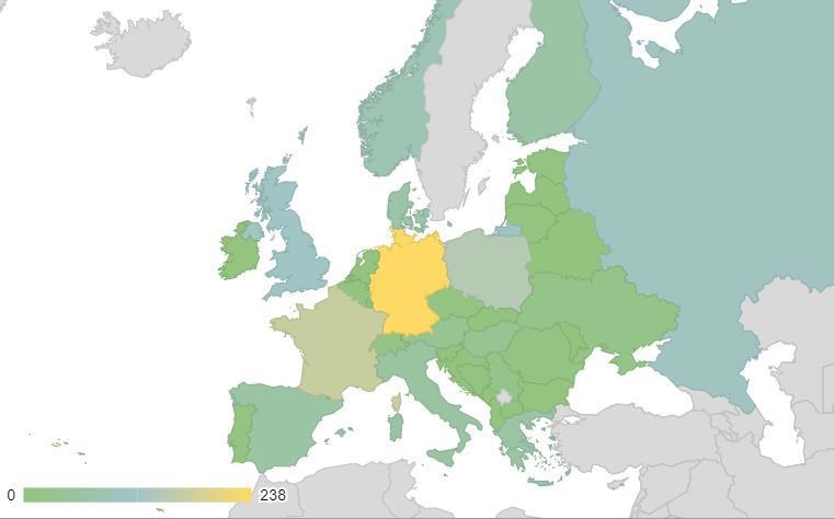 Så här blev kartan, jag valde att exkludera Sverige i och med att sidan är svensk, den förstörde färgskalan då alla andra länder fick i princip samma färg eftersom att Sverige nämnts omkring 1800 gånger.