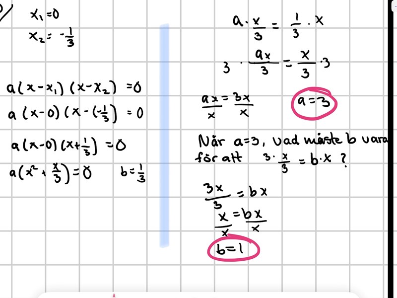 Du har kommit så långt att du har en ekvation som har lösningarna x1=0 och x2=-1/3. Det har den för alla värden på a.
