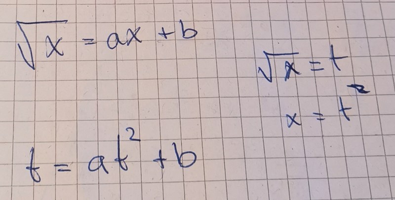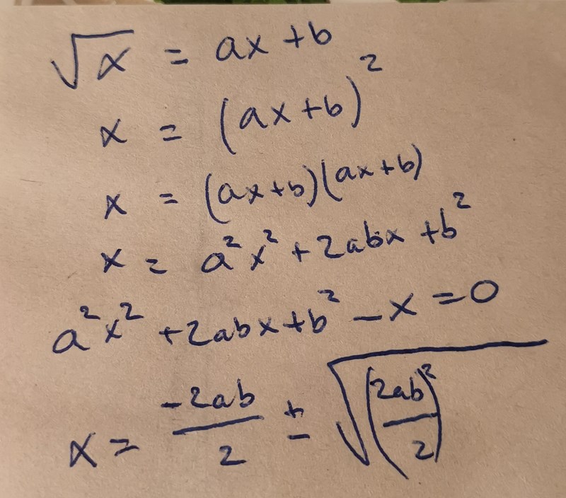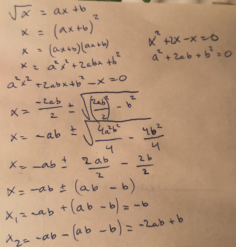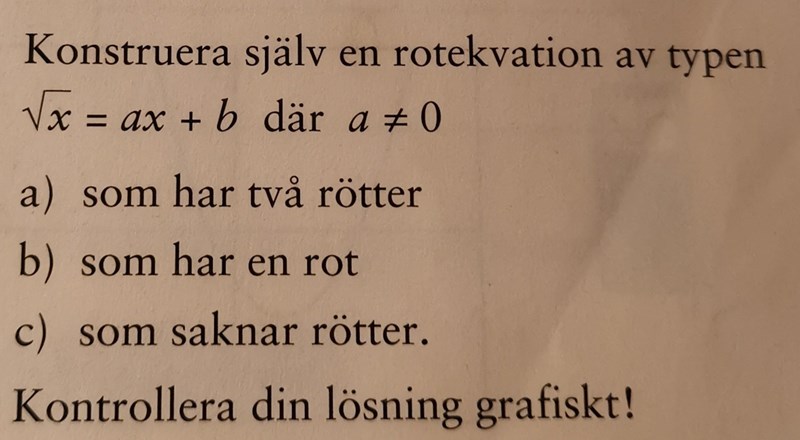 Du skall utgå från ekvationen x=ax+b\sqrt{x}=ax+b. Kvadrera båda sidor och undersök vad som gäller för a och b för att ekvationen skall få det önskade antalet rötter.